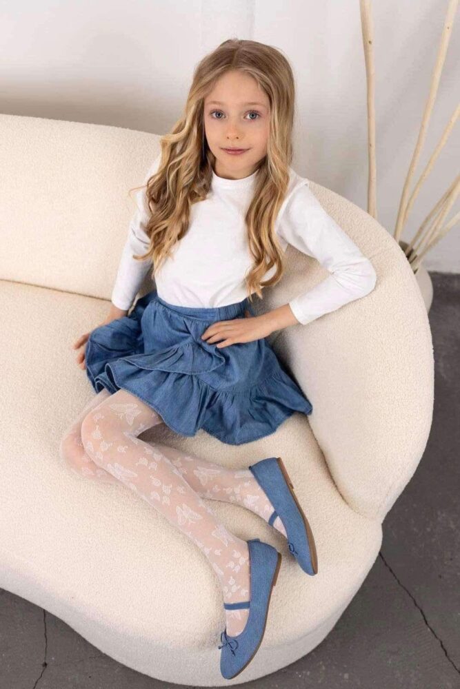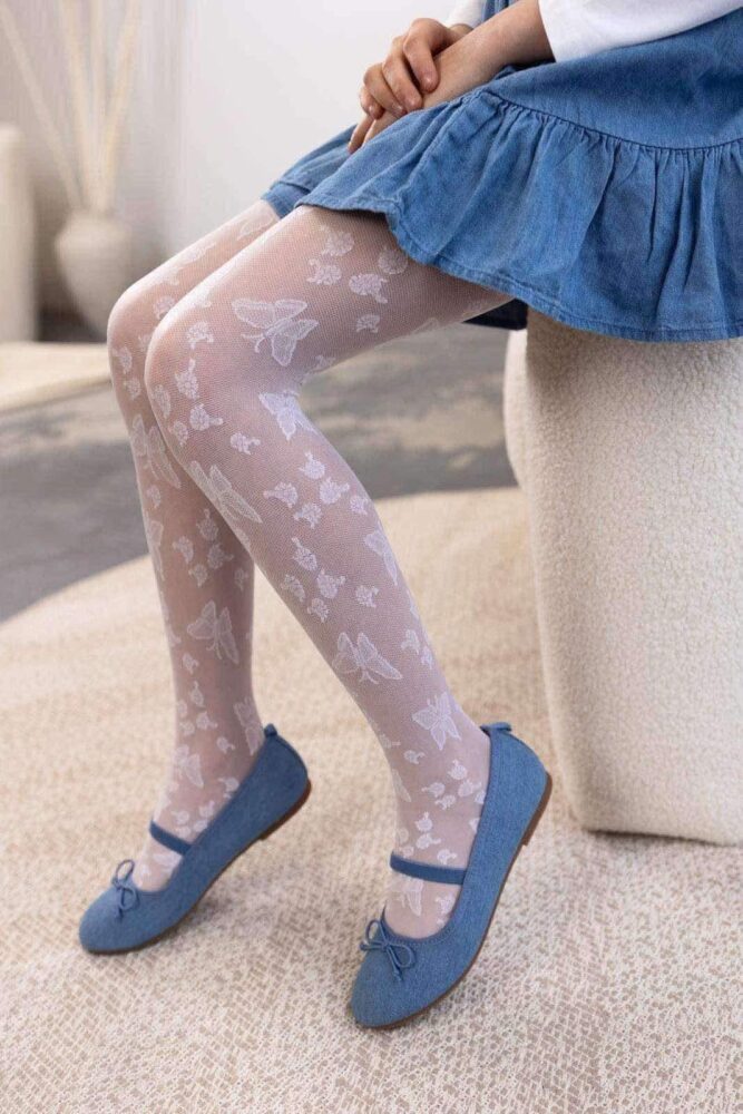 Rajstopy dziecięce ozdobione delikatnym wzorem małych kwiatków i motylków.